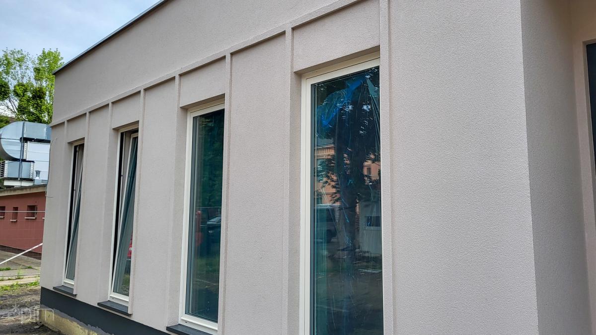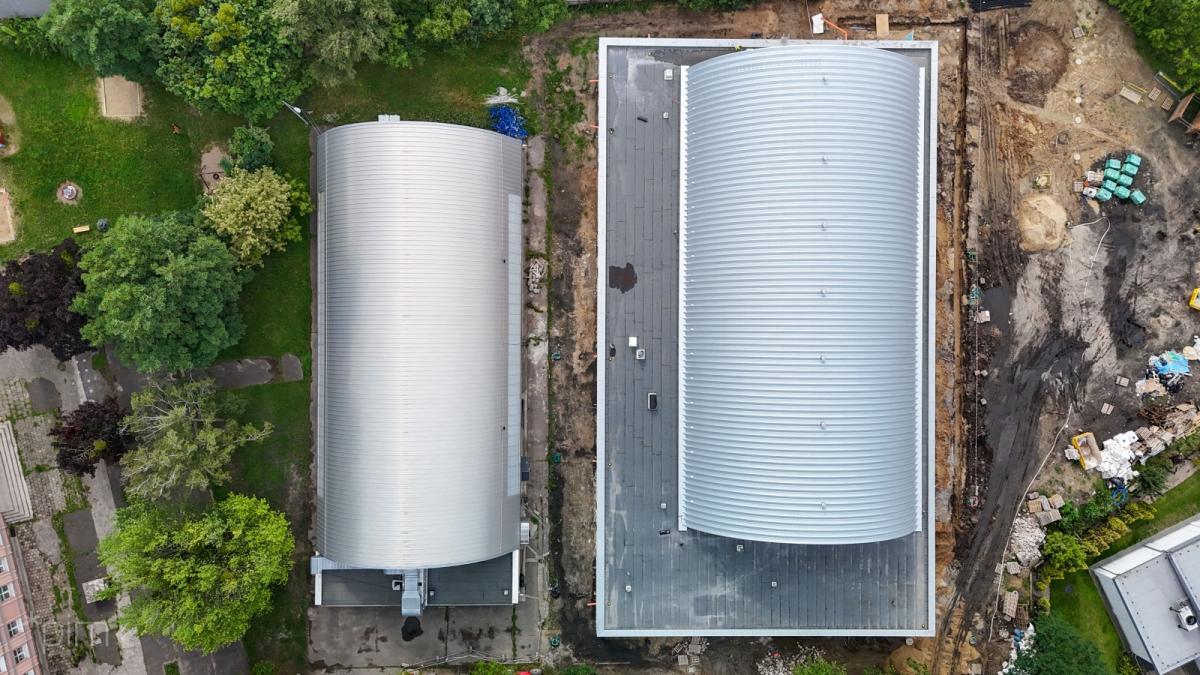 Nowa sala w Zespole Szkół nr 8 w Poznaniu, będąca częścią Łazarskiego Centrum Sportu, zyskuje coraz bardziej wyraźny kształt. Prace idą zgodnie z planem, a jej oddanie do użytku planowane jest na koniec października. Budynek zostanie podzielony na trzy funkcjonalne części, zapewniając nowoczesne zaplecze nie tylko dla judoków, ale także dla uczniów z oddziałami sportowymi.)((((prowsze zdjęcie pokazuje zewnętrzne prace wykończeniowe budynku, na kolejnym widać montaż instalacji wewnętrznych, a na ostatnim wnętrze sali sportowej w trakcie prac wykończeniowych)))